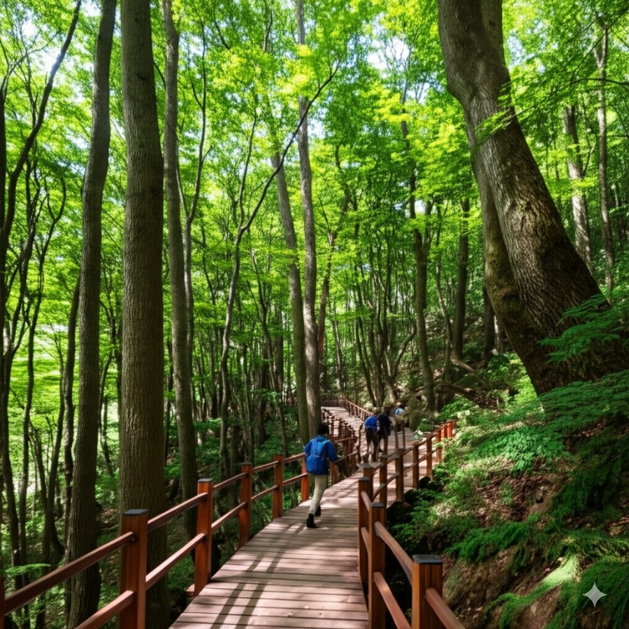 <이미지: 햇살이 쏟아지는 아름다운 용문산 자연휴양림의 숲길을 걷는 사람들의 모습>