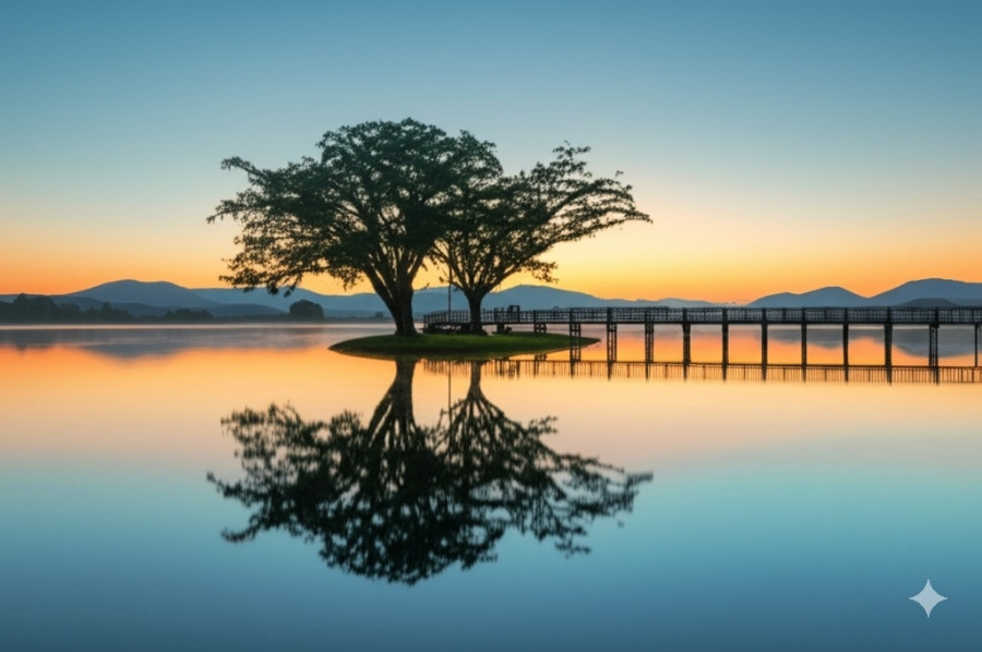<이미지: 잔잔한 강물과 새벽 안개가 어우러진 두물머리의 아름다운 풍경과 랜드마크인 느티나무>