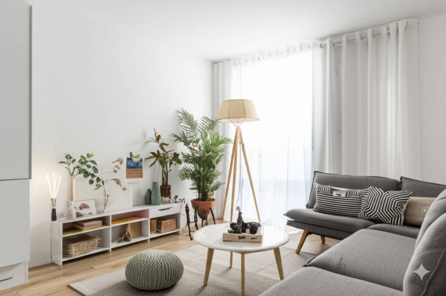<이미지: 밝고 화사한 20평대 아파트 거실 인테리어 (흰색 벽, 밝은 우드톤 가구, 식물 등으로 꾸며진 모습)>