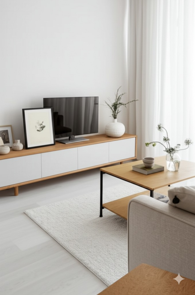 <이미지: 화이트 & 우드톤의 미니멀한 20평대 아파트 거실 인테리어>