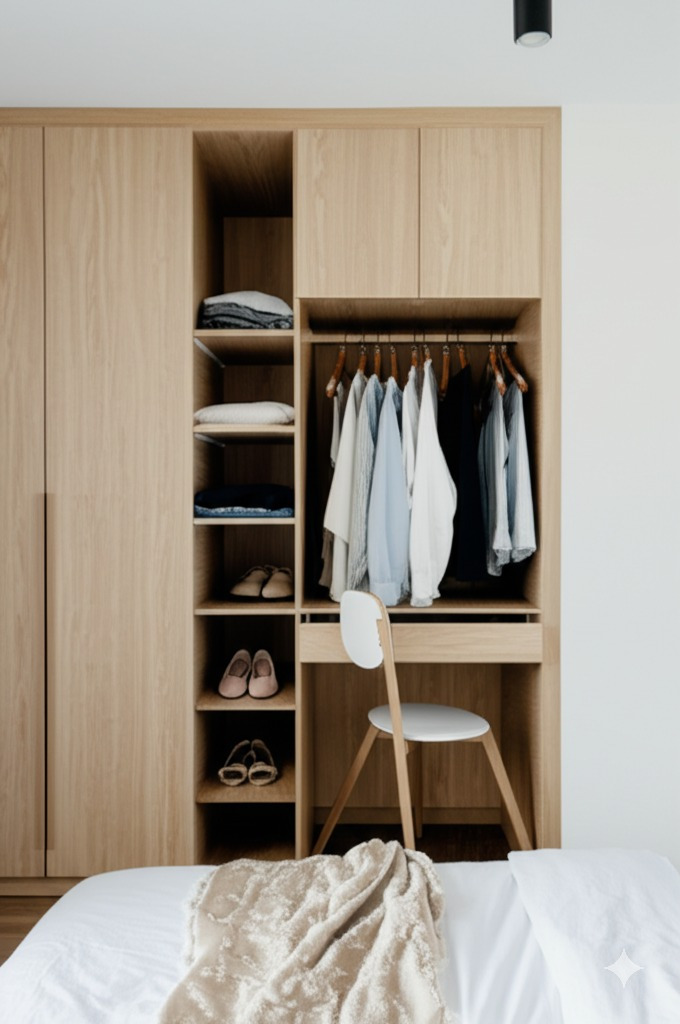 빌트인 가구 활용: 붙박이장, 시스템 선반 등을 설치하여 수납공간을 확보하고 깔끔한 인테리어를 연출합니다. 천장까지 활용하는 키큰장을 설치하면 더욱 많은 수납이 가능해요.