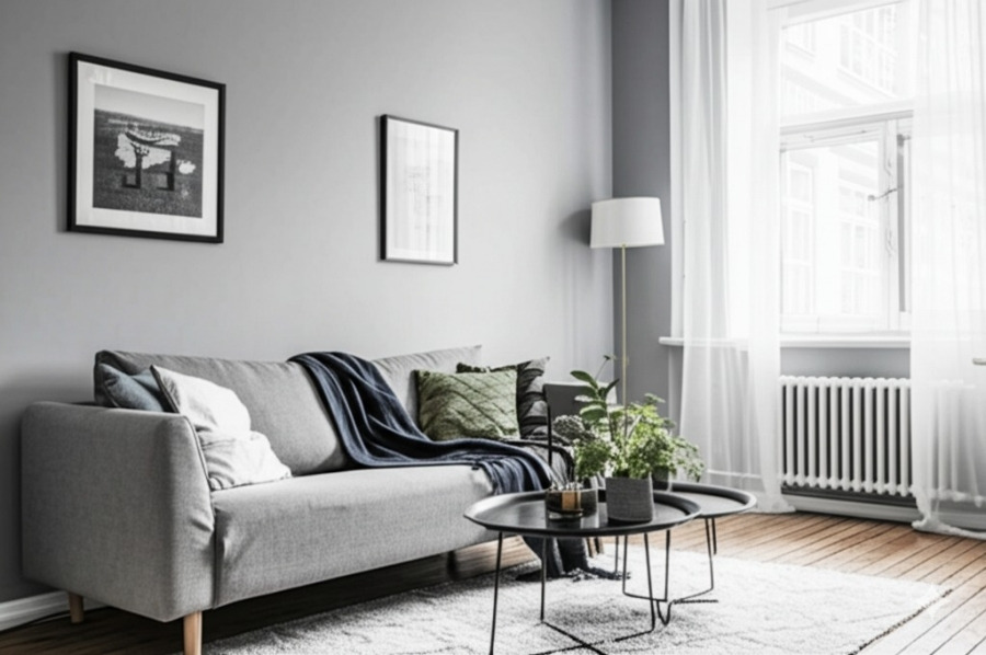 <이미지: 밝은 그레이톤 벽과 톤온톤 가구로 꾸며진 20평대 아파트 거실>