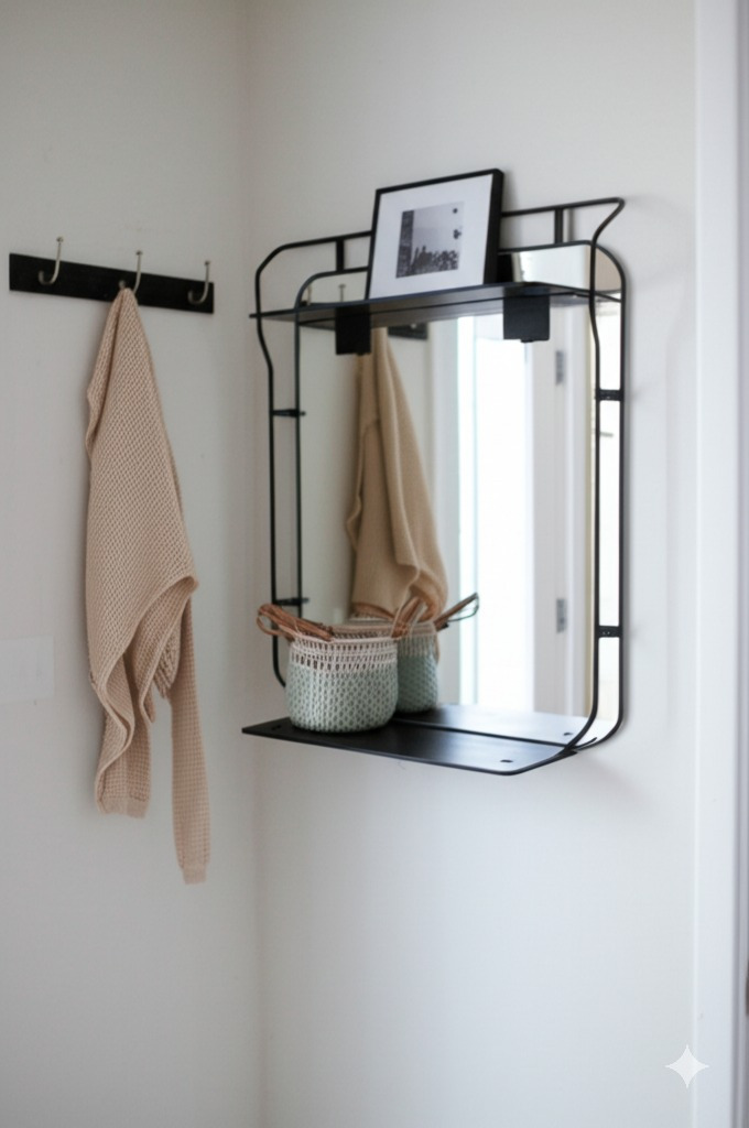 <이미지: 벽 선반과 거울로 꾸며진 20평대 아파트 현관 인테리어>