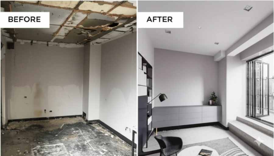 <이미지: 20평대 아파트 인테리어 Before & After 비교 사진 (좁고 답답한 모습에서 넓고 세련된 모습으로 변화된 모습)>