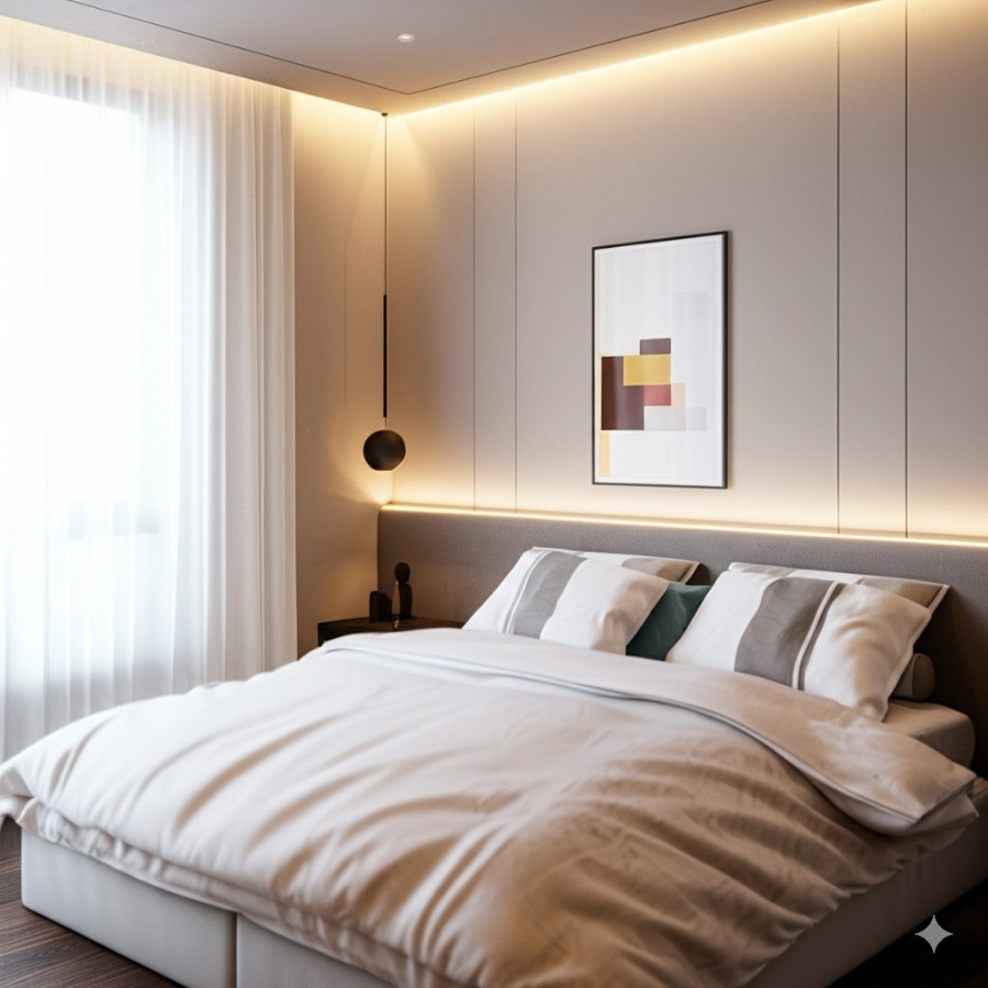 <이미지: 다양한 간접 조명이 활용된 20평대 아파트 침실 인테리어>