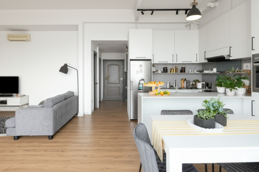 <이미지: 거실과 주방이 오픈된 형태의 20평대 아파트 인테리어 (아일랜드 식탁이 공간 분리 역할)>